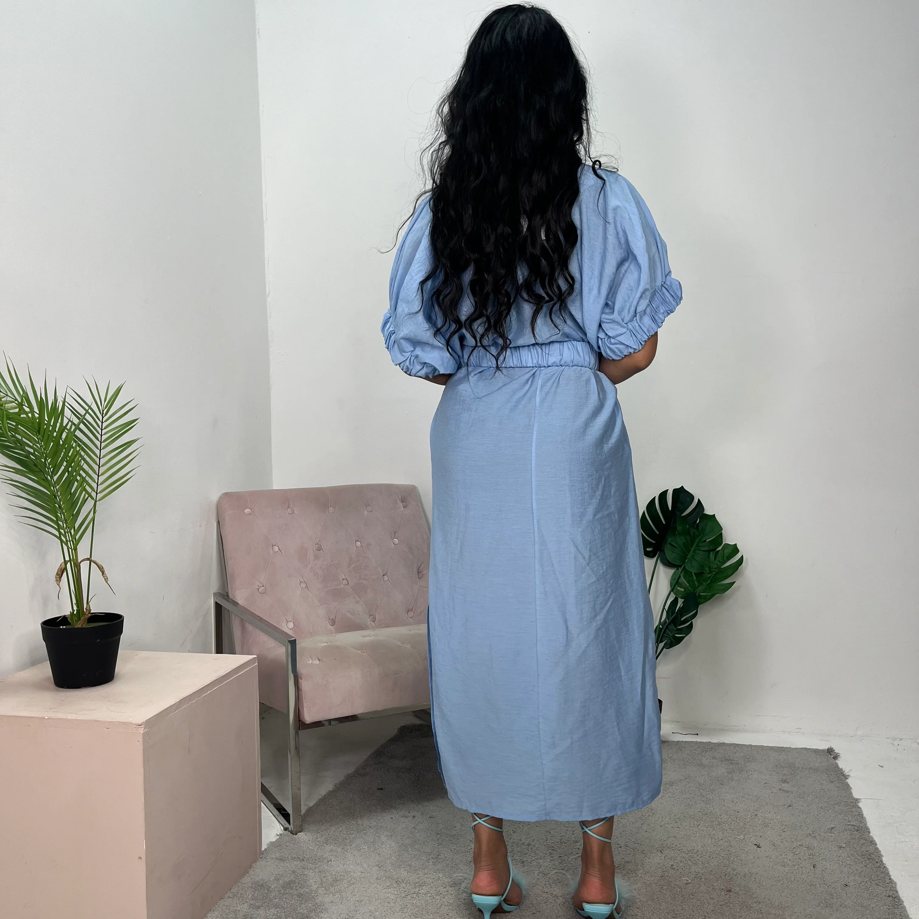 Gauri Blue Puff Sleeve Side Split Belted Dress