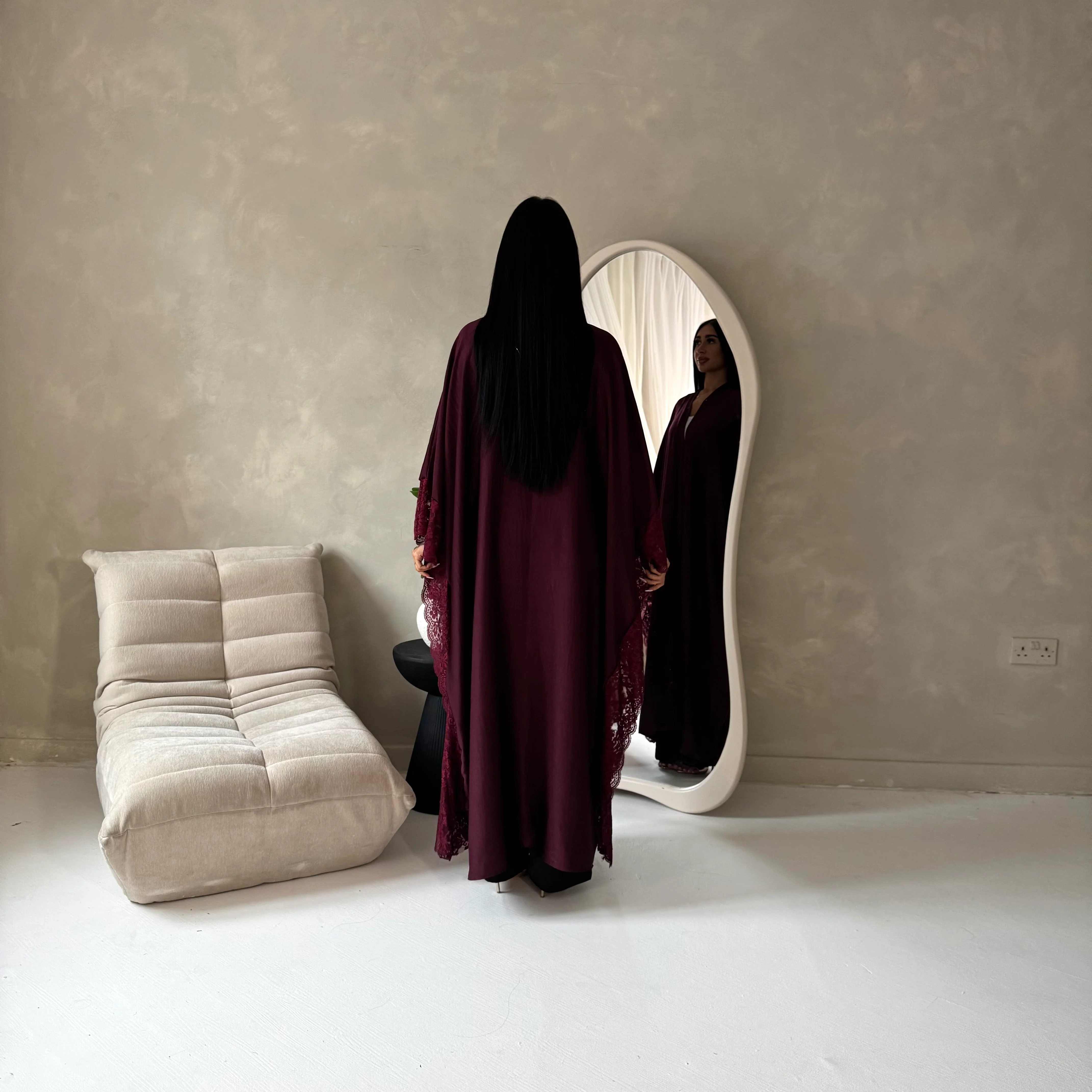 Kajol Wine Lace Detail Open Modest Abaya Jacket featuring elegant lace accents and a flowing open-front design. Perfect for layering, this sophisticated piece adds effortless style and modest elegance to both everyday and occasion looks.